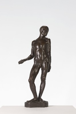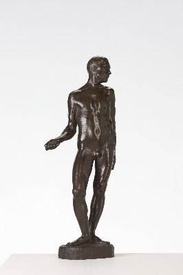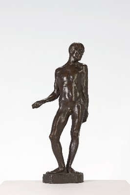 | Beschreibung | Nach seinen Anfängen als Tierbildhauer – „… bis mich vor den Käfigen im Zoo die Verzweiflung packte. Schneller Erfolg schien Warnung“ – ist der „Stehende Mann“ von 1910 die erste menschliche Figur im Werk von Gerhard Marcks. Modell dazu stand der Bildhauer Richard Scheibe (1879-1964), mit dem er das Atelier teilte und der ihm Ratgeber und Freund war. Marcks nahm das klassische, für ihn aber neue Motiv der menschlichen Gestalt sehr ernst. Bis zu drei Stunden täglich zeichnete er Akte und beschäftigte sich am Abend mit Anatomiestudien. Seiner damaligen, von Auguste Rodin beeinflussten Vorstellung, dass sich die Figur auch über die Kontur zu erschließen habe, trägt die etwas exaltierte Pose des Mannes Rechnung. |