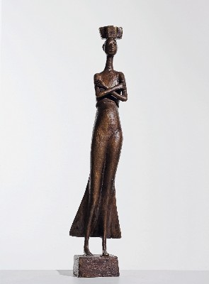 | Beschreibung | Die Figur entstand unter dem Eindruck einer 1955 erfolgten Reise nach Namibia, dem damaligen Südwestafrika. Gerhard Marcks war begeistert von den Menschen, den Tieren und der Landschaft. Besonders die Frauen der Herero hatten es ihm angetan. Er rühmte „wie majestetisch (sie) langsam in ihren farbigen Roben über die Straße schreiten. Sowas von Figuren! Diese schmalen Köpfe, zarten Nacken, flache Schultern, feinen Hände und langen Läufe. Die Missionare haben ihnen die Kleider (und die TBC dazu) aufgeschwatzt, die Hereros haben eine Kunst daraus gemacht.“ Zurück in Köln fanden die vor Ort in Zeichnungen festgehaltenen Gestalten ihre bildhauerische Quintessenz in der schlanken, kegelförmig aufgebauten und nicht zuletzt dadurch eine große Würde ausstrahlenden Plastik. Previous |