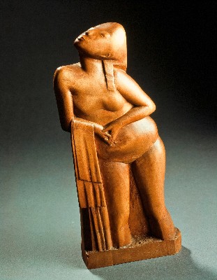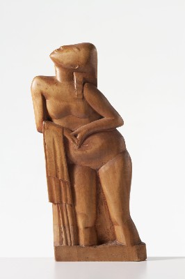 | Beschreibung | Beeinflusst durch den Expressionismus entfernte sich Gerhard Marcks seit 1916 mehr und mehr von einer am Naturvorbild orientierten Auffassung der Figur. Die Grundformen sind nun kubischer und stark vereinfacht gestaltet, teils in den Proportionen auch verzerrt. Zum „Frauenakt mit Tuch“ sah sich Marcks eigener Aussage zufolge durch die Auseinandersetzung mit der ägyptischen Skulptur angeregt. In der nur 6 cm flachen Statuette ließ sich Marcks mit dem zurückgelegten Kopf und den angeschnittenen Beinen zudem von der maximalen Ausnutzung des brettartigen Holzes leiten. Das Material ist typisch für diese Zeit. Es entsprach zum einen den Vorstellungen einer traditionell handwerklichen Kunst, wie sie auch von Marcks zu dieser Zeit verfochten wurde. Zum anderen war es ein Material, dass auch in der ländlichen Umgebung von Dornburg mühelos zugänglich war. |