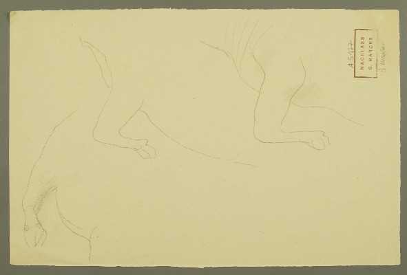 | Titel | Stehende Kuh Frontalansicht, Studie Beine liegender Kuh, 3x, Vorzeichnung kleine liegende Kuh |