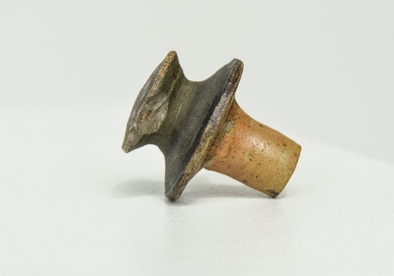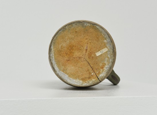 | Beschreibung | Die Henkelflasche hat zwei Urheber. Das eigentliche Drehen der Form wird Johannes Driesch zugeschrieben, das Dekor Gerhard Marcks. Driesch gehörte in der Keramischen Werkstatt des Staatlichen Bauhauses 1920 zu den ersten Schülern von Marcks, der dort als Formmeister für die ästhetische Bildung zuständig war. 1922 gab Driesch jedoch die Töpferei zu Gunsten der freien Kunst auf. Marcks, der Driesch sehr schätzte, unterstützte diese Entscheidung. Die etwas gedrungene, aber von der Form her sehr ausgewogene Henkelflasche birgt eine Überraschung: Sie durchzieht rechts vom Henkel ein tiefer Riss vom Boden bis zur Schulter. Dieser Riss entstand bereits beim Brand. Zum Gebrauch war die Flasche daher nie geeignet. Trotzdem verwahrte Marcks, aus dessen Nachlass sie stammt, sie bis zu seinem Tod, bevor sie 1988 in die Sammlung der Gerhard-Marcks-Stiftung gelangte. - „Auf wulstig verbreitertem Standring bauchige Flaschenform mit kurzem, konisch nach oben verjüngtem Hals; kurze konische Röhrentülle und massiver Bandhenkel vom Halsansatz zur Gefäßmitte. Stöpsel mit spulenförmigem Knauf. Hochgebrannte Irdenware, sandfarbener, grob schamottierter Scherben, freigedreht. Schulterzone, Tülle , Henkel und zwei Streifen am Hals dunkelmoosgrün engobiert; Halsansatz und Henkelkanten mit Streifen aus dunkelbrauner Engobe akzentuiert.“ Beschreibung und Materialangaben aus „Keramik und Bauhaus“, Ausst. Kat. Bauhaus-Archiv, Berlin 1989, S. 149, Nr. 153 |