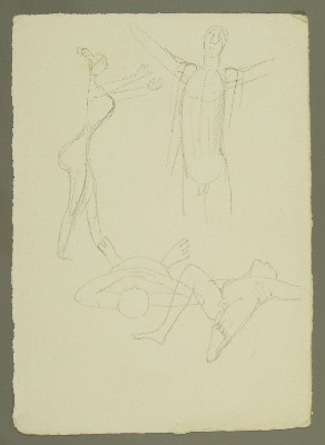 Weiblicher Akt Hände nach vorne streckend, Seitenansicht, männlicher Akt Arme nach oben streckend, zwei liegende männliche AkteGerhard Marcks
