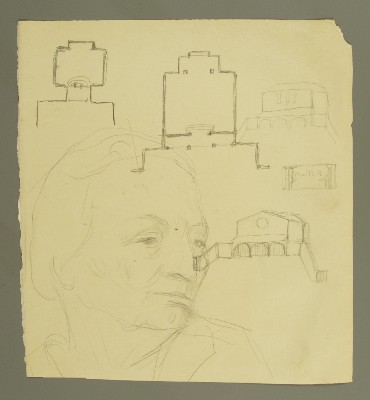 Architekturentwurf, Grundriss, Schrägsicht, Porträt weibliche Gewandfigur; Detailansicht Pfeiler, FassadeGerhard Marcks